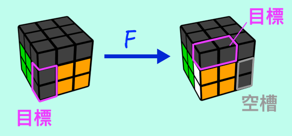 轉 F 後,右前出現了「空槽」但目標浮到了頂層,要想辦法把邊角連成一條放在上面,最後 F' 還原