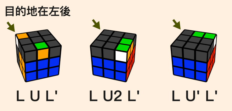 找到一組 F2L 要能馬上知道目標槽在哪:左後、右後、左前,還是右前?因此你必須直覺反應左邊、右邊、跟背面中心是什麼顏色