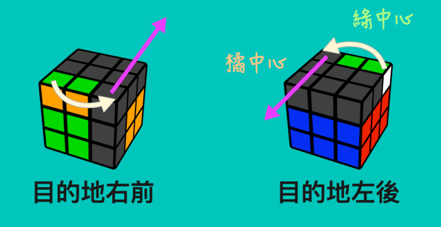 - 如果邊塊橘色向上,則橘色中心在背後(也就是面對紅色)比較順手