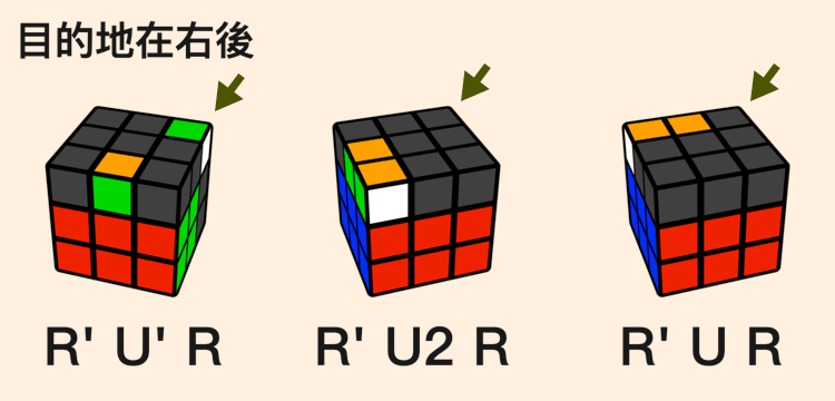 目標雖然已在背面(左後),但是不符合基礎型態,無法用順手的方式做(注意邊塊橘色向上,但橘色中心並不在背面)。這時候可以 y 順時針換面,讓目標在右後,就變成基礎型態 R' U R