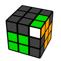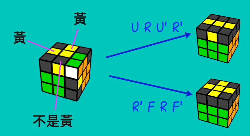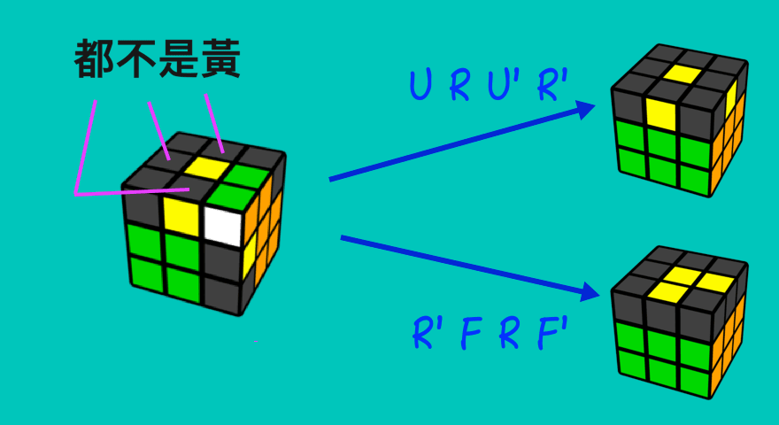 類似道理,當頂面四邊都不是黃的時候,用榔頭以後,頂面十字會出現兩格黃色,以避免「單點 OLL」的狀況