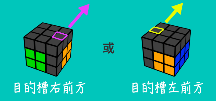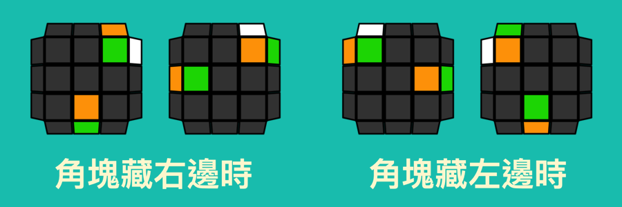 當角塊邊塊朝上的顏色不同,試著配成「異色基本型」。先嘗試目標槽在右的藏法:角塊轉到右後方