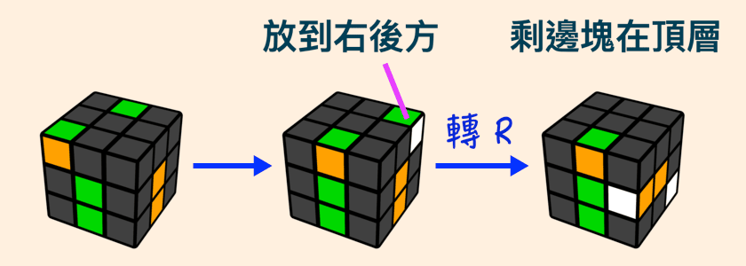 要藏角塊有兩個地方,先試試目標槽在右前的藏法:轉頂層把角塊放在右後方,再轉 R 就能把角塊藏起來。這時邊塊在頂層可以自由移動,不會影響角塊