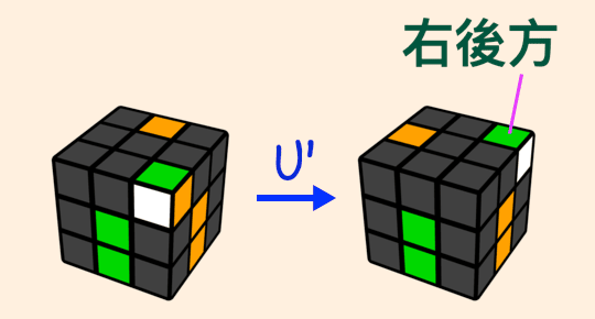假設角塊會重新出現(右後方),邊塊要移到哪才會變成「同色基本型」呢?答案如下