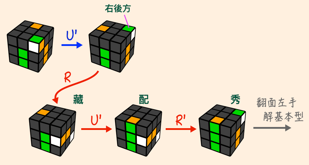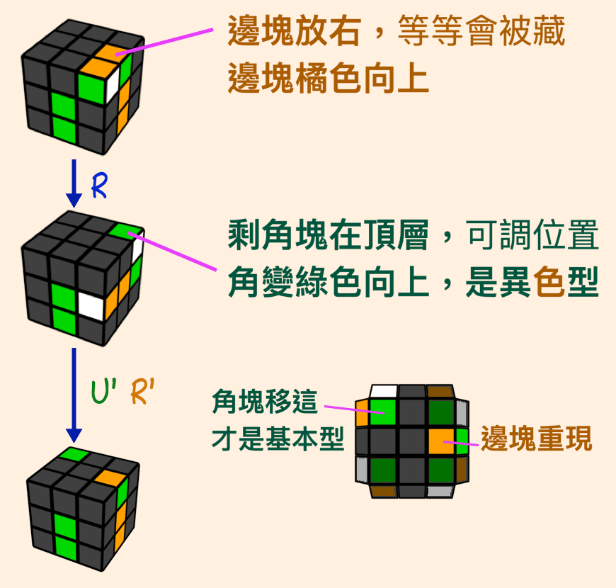 把邊塊轉到那個地方,然後 R' 不藏了讓角塊出現,就會配對成基本型。注意最後一步「秀」是「藏」的相反:也就是復原白色十字